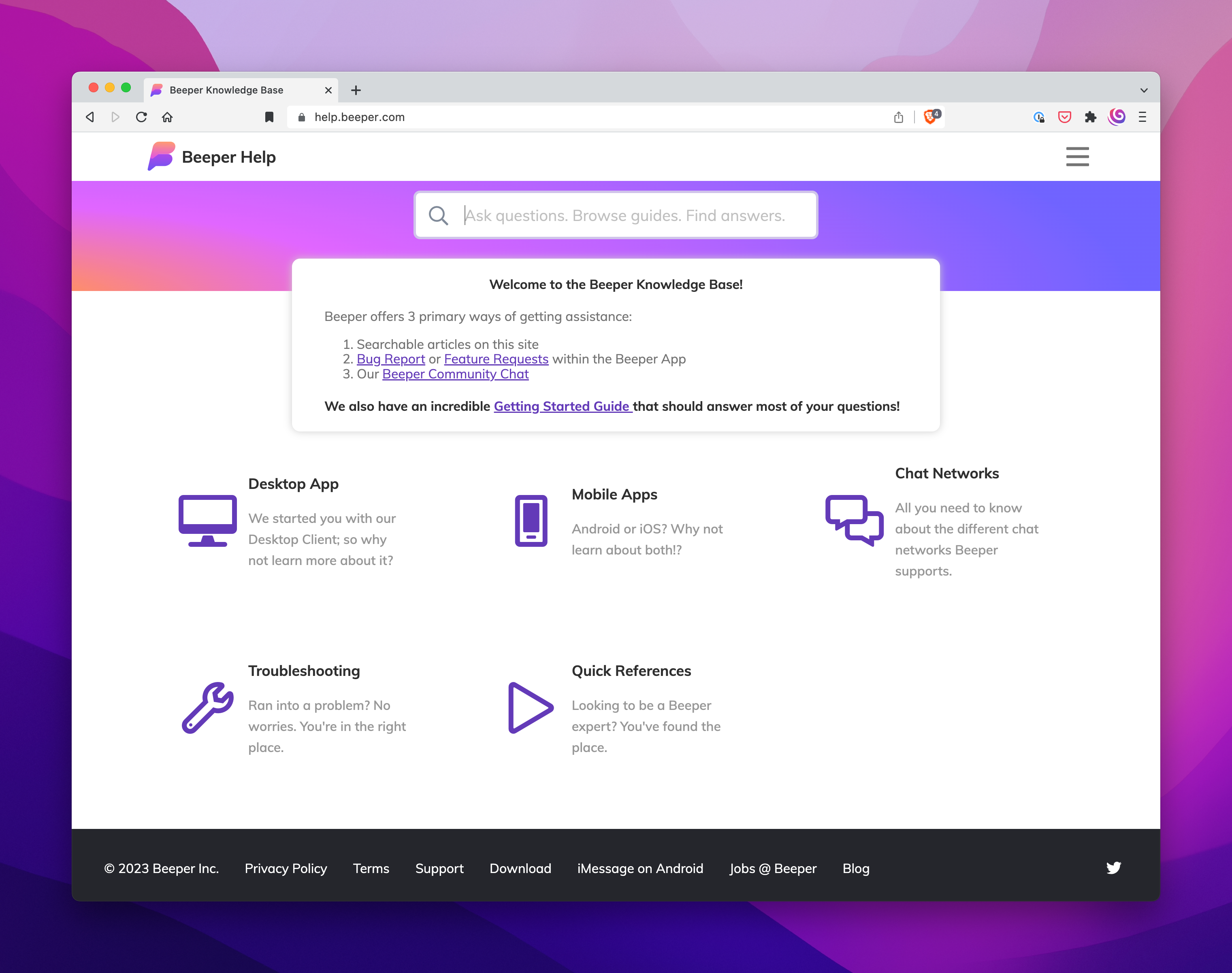 Your Beeper Helper pulls its knowledge from help.beeper.com—our main support hub—where you can: