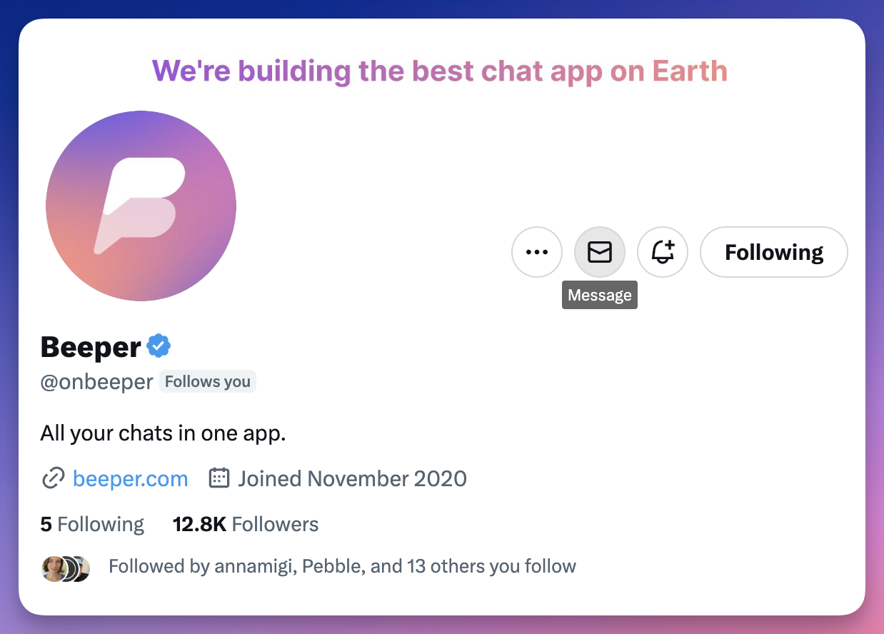🐣 Sending a Twitter DM to @onbeeper routes directly to our Concierge team—a good open channel for folks who aren’t Beeper users yet.