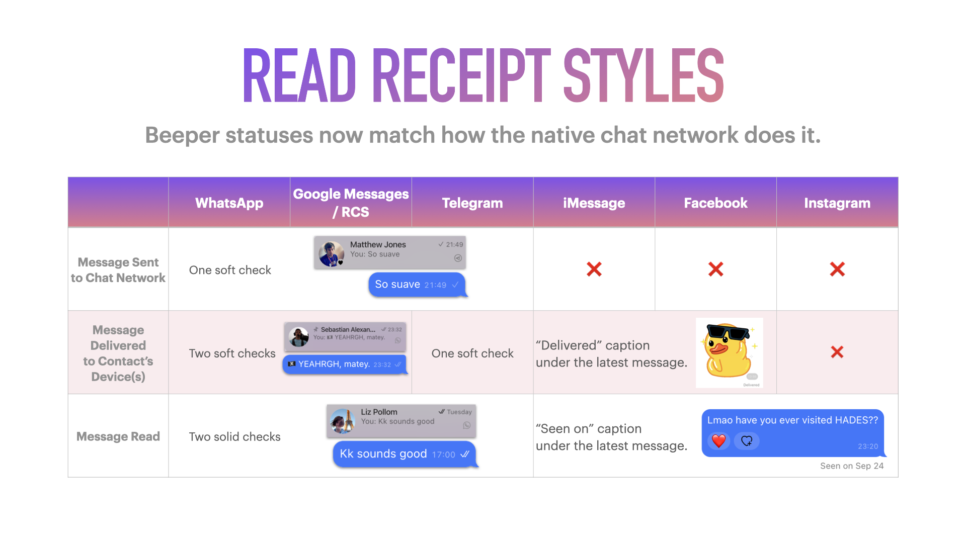 Read receipts now match how each native chat network does it. Aligning these Beeper elements with the native networks’ styling makes your experience more natural and familiar—a good thing if you ask us!