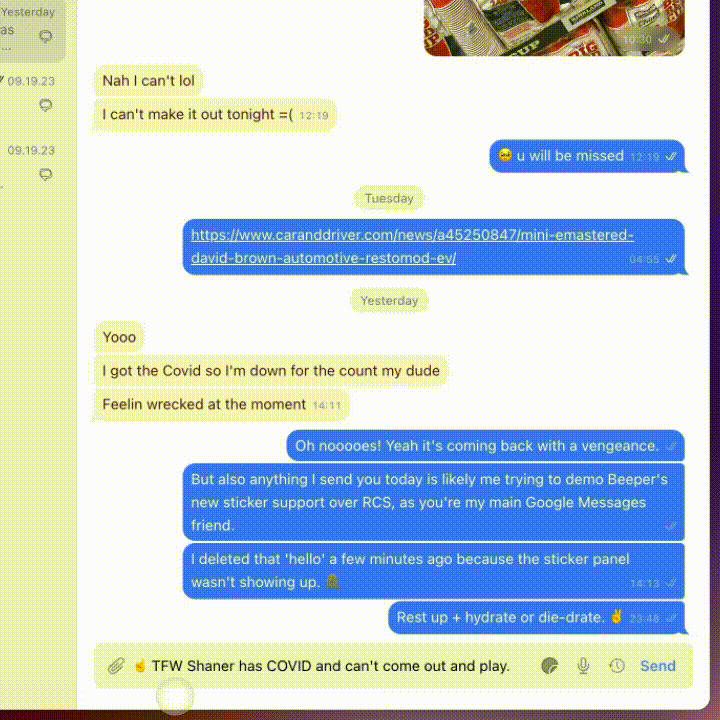 Beeper can send and receive media like photos, videos, links, voice messages and more. But the experience is not beautiful and feels a bit clunky. We’re going to make it fast and feel awesome. Expect full sticker support (plan is to import all Telegram stickers), faster uploads, iMessage live photos and more!