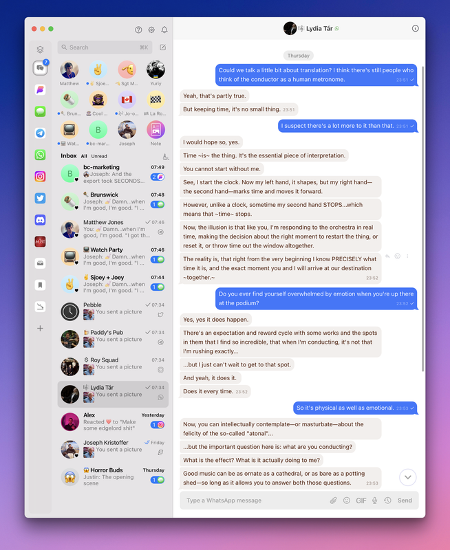If you expect 100% feature parity to all other chat apps, you’re not going to have a great time. Beeper works great alongside existing apps, not replacing them entirely. 99% of your daily usage will be in Beeper, but from time to time you may have to go back to the original app for a rarely used feature.