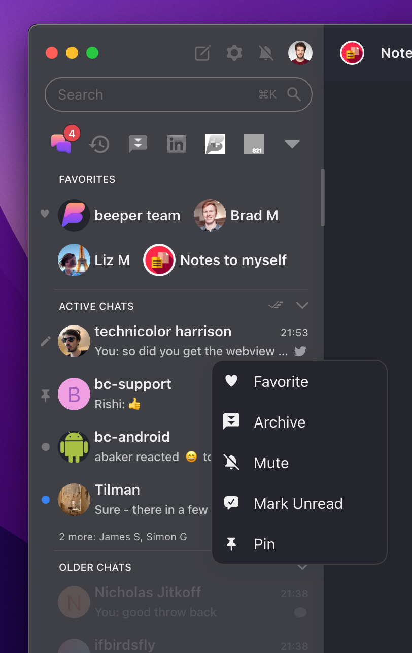 Task 1 starts with the concept of Favorites, but will be something that we continue to work on and improve forever. We explicitlydo not want to turn chat into email. Email feels like work. Chat still feels fun. We cannot lose that!Task 2 is what we are calling Inbox 3.0. It’s a made up number (true version is probably way higher!) This will include new tools to quickly triage chats and take action (snooze, pin, archive), and a new interface that is organized around the concept of an active chat. You can turn it on now in Beeper Desktop → Settings → Labs.