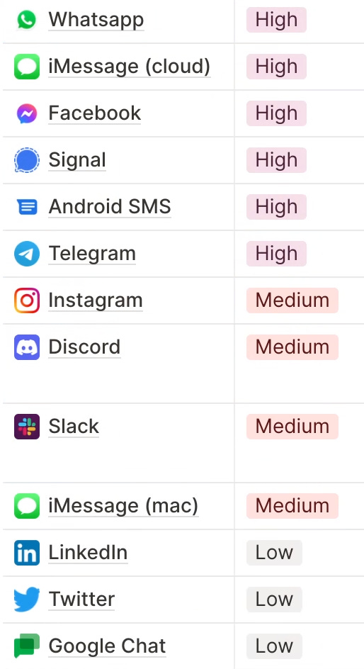 We have support for 12+ chat networks in Beeper, but some chat networks are more important than others (based on usage among current and prospective Beeper users). We use this list when prioritizing new features and deciding when to fix smaller bugs.